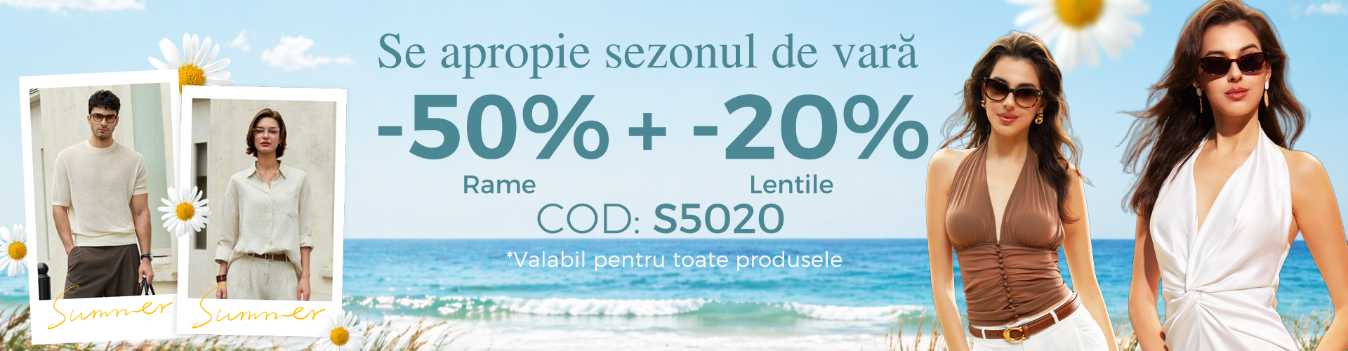 2.Folosiți codul „S5030”. Beneficiați de -50% la rame și -20% la lentile.